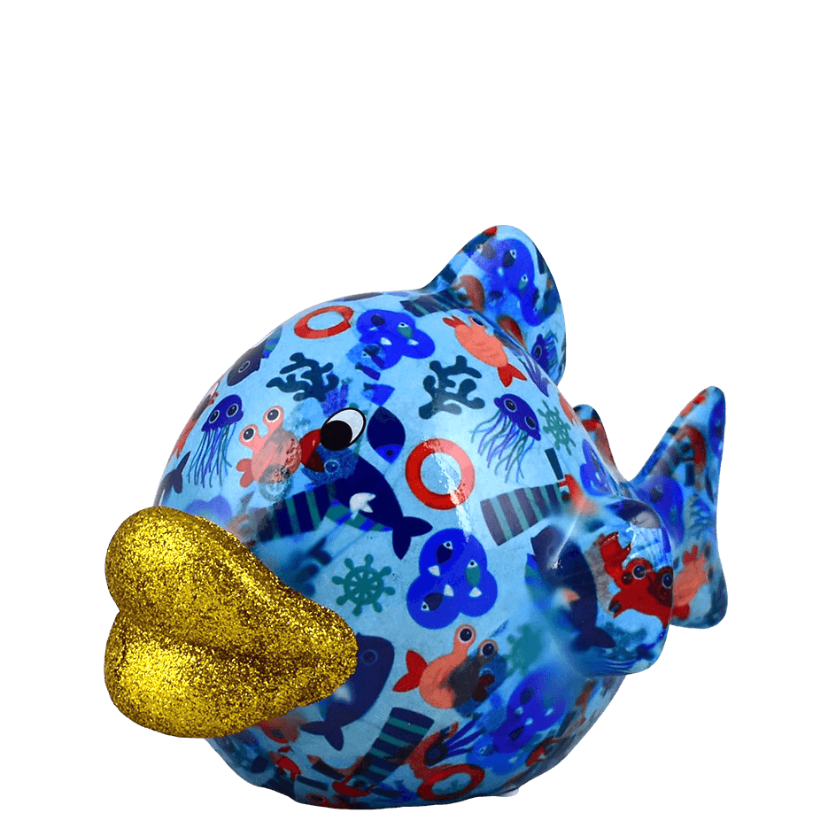 Kelly loves the water. As the 'Colorful Bubbly Fish', you can always find her among the beautiful, colourful coral, where she is safe and far away from dangerous fishing nets. Together with her friends, she can play the best water games for hours. Fish Kelly is available as a money box in the sizes Small (S) and Medium (M).
